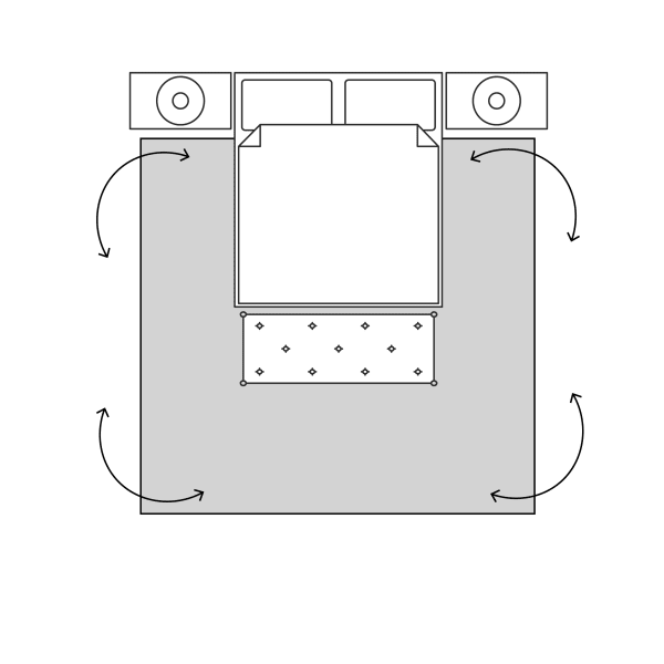 If the room is smaller or the rug is not large enough to hold all furniture pieces, tuck the rug under the bed just up to the nightstands.