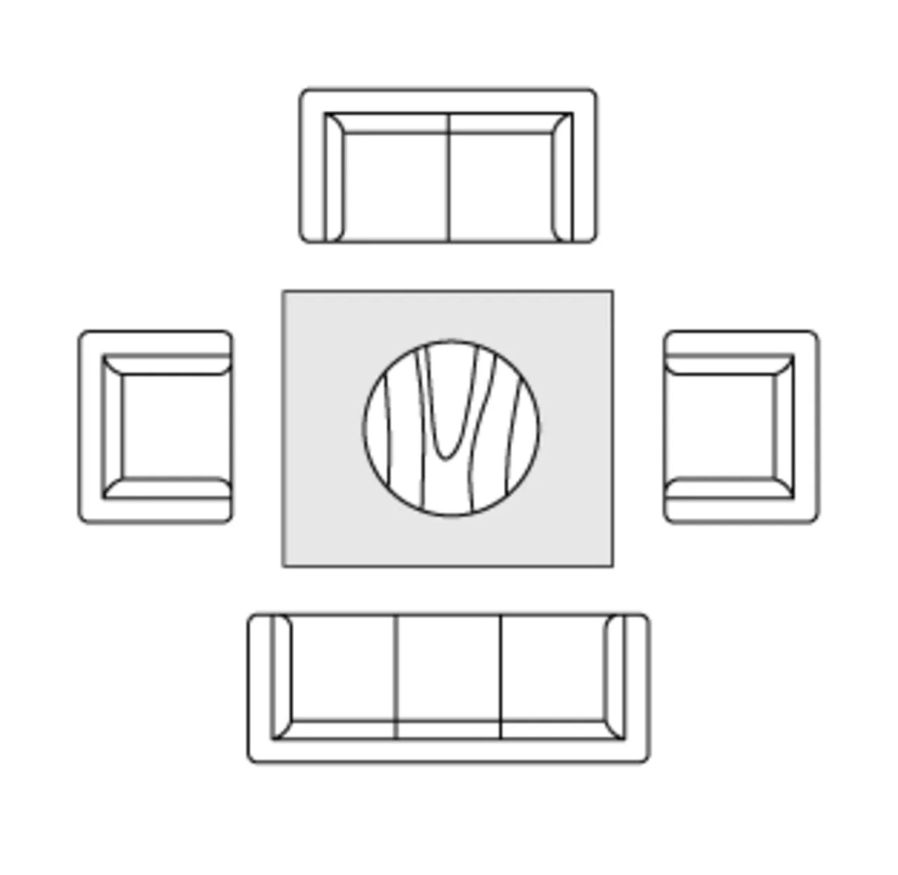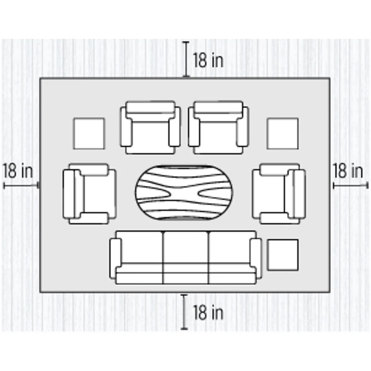 Living Room | 6' x 9' → 10' x 14' | Keep at least the front legs of the furniture on the rug for a finished look and to anchor the space. |