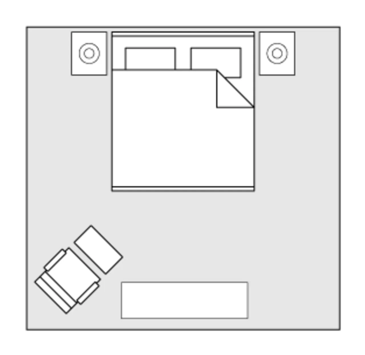 If the primary bedroom is sizable, we recommend that all furniture is placed on a large area rug—queen or king size bed plus two nightstands.